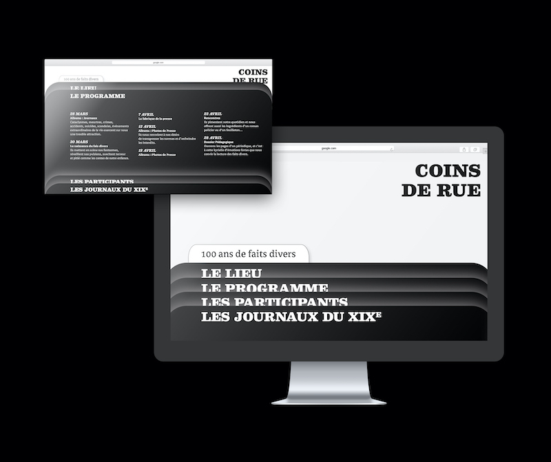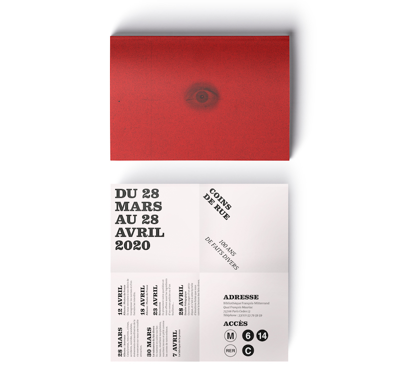 La demande formulée pour ce projet consistait en la création d’une identité visuelle destinée à une exposition nommée « coins de rue », traitant des faits divers, à la BNF du 28 mars au 28 avril 2020.