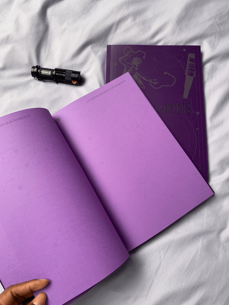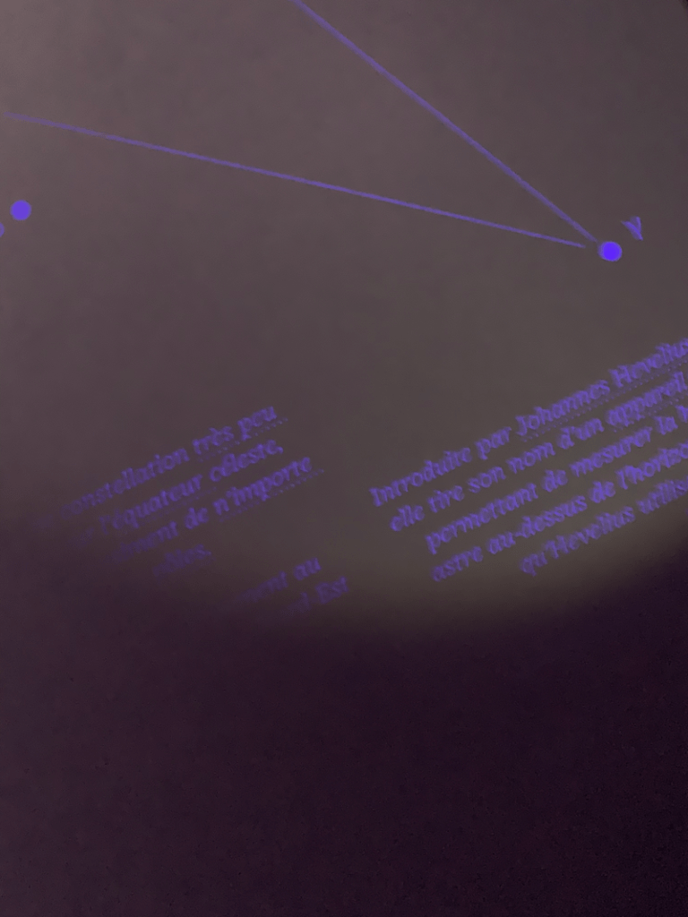 Cet objet éditorial met en valeur les constellations par un processur d’impression Ultra-violet, une encre visible uniquement avec une lumière UV. La lecture est optimale dans le noir tout comme l’observation des étoiles.