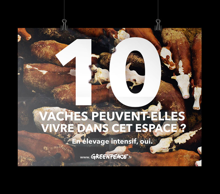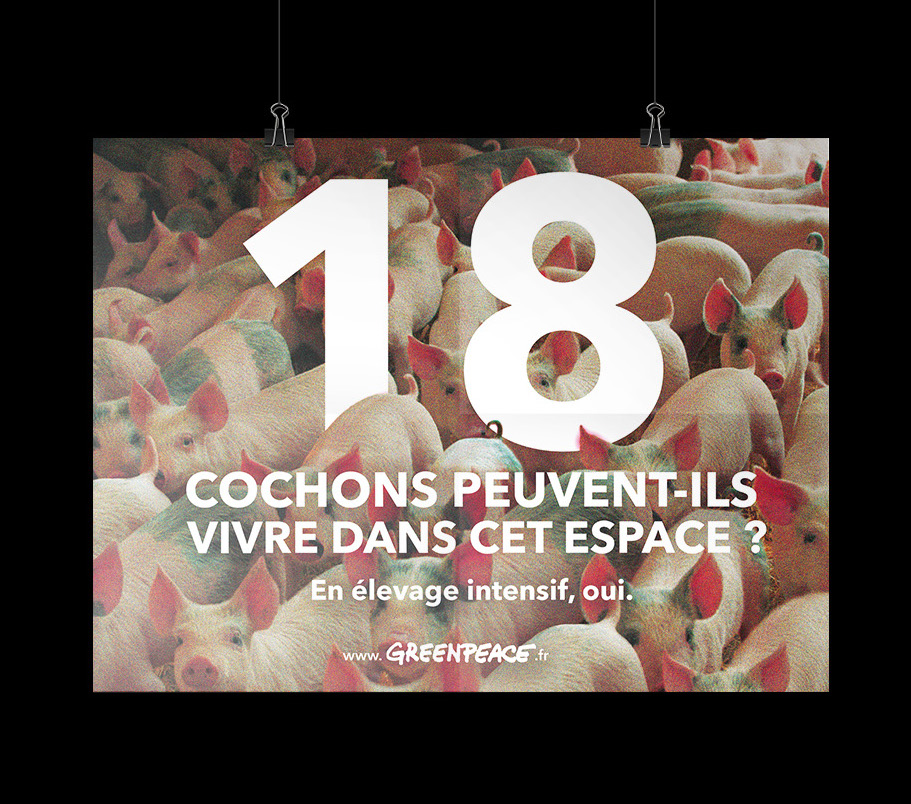 Greenpeace France décide de lancer une campagne de communication ciblant l’élevage intensif, une technique de production qui a des répercussions importantes, aussi bien sur notre santé que sur l’environnement et le bien-être animal.