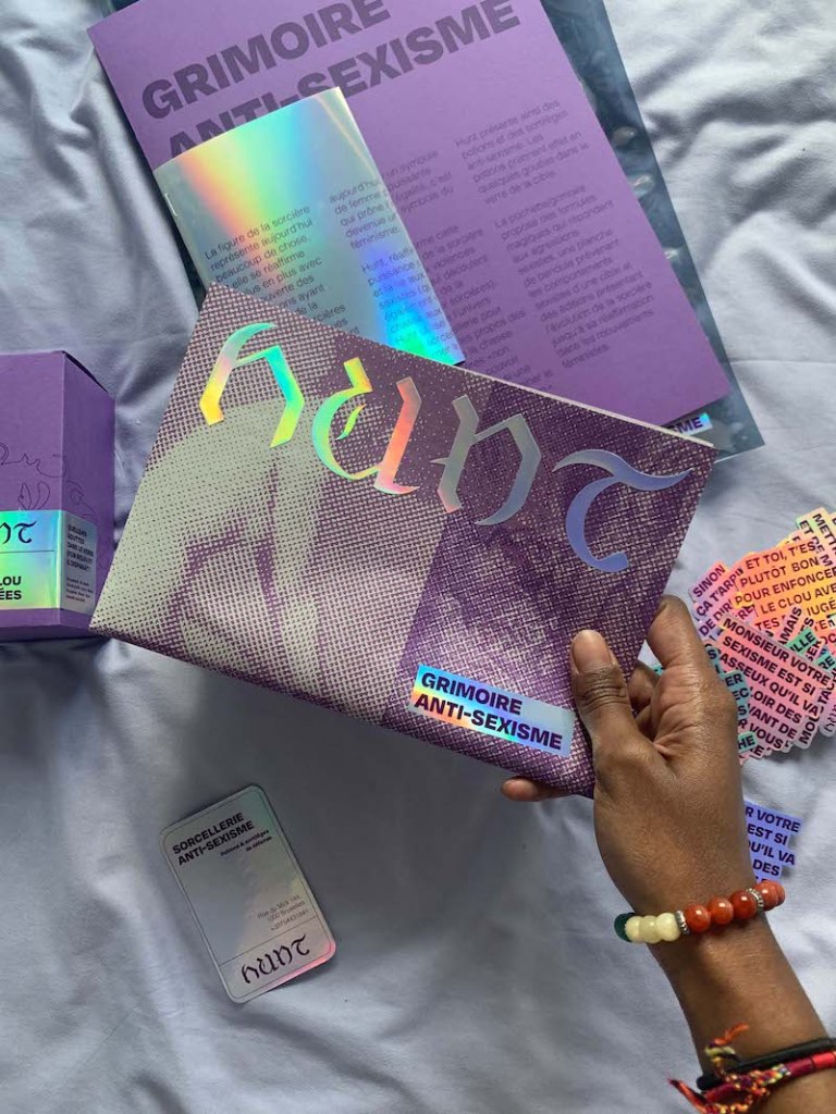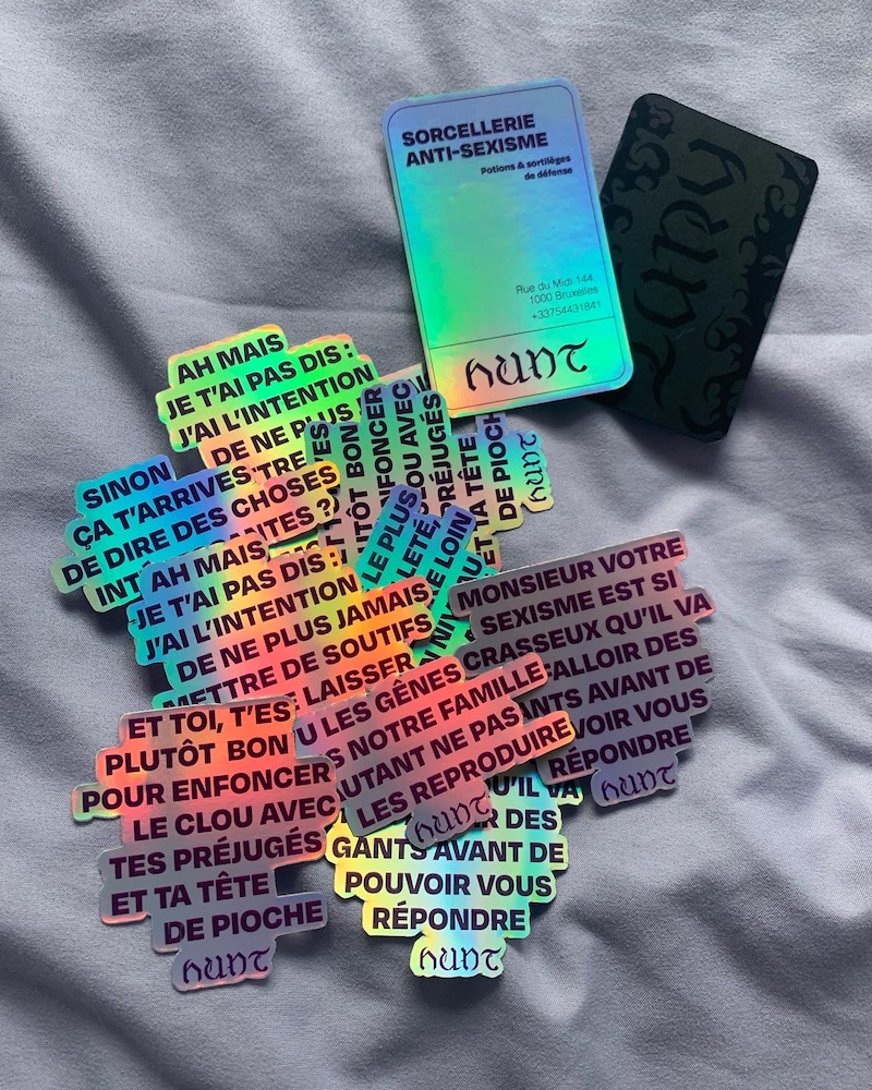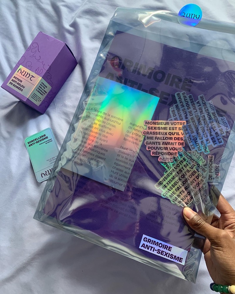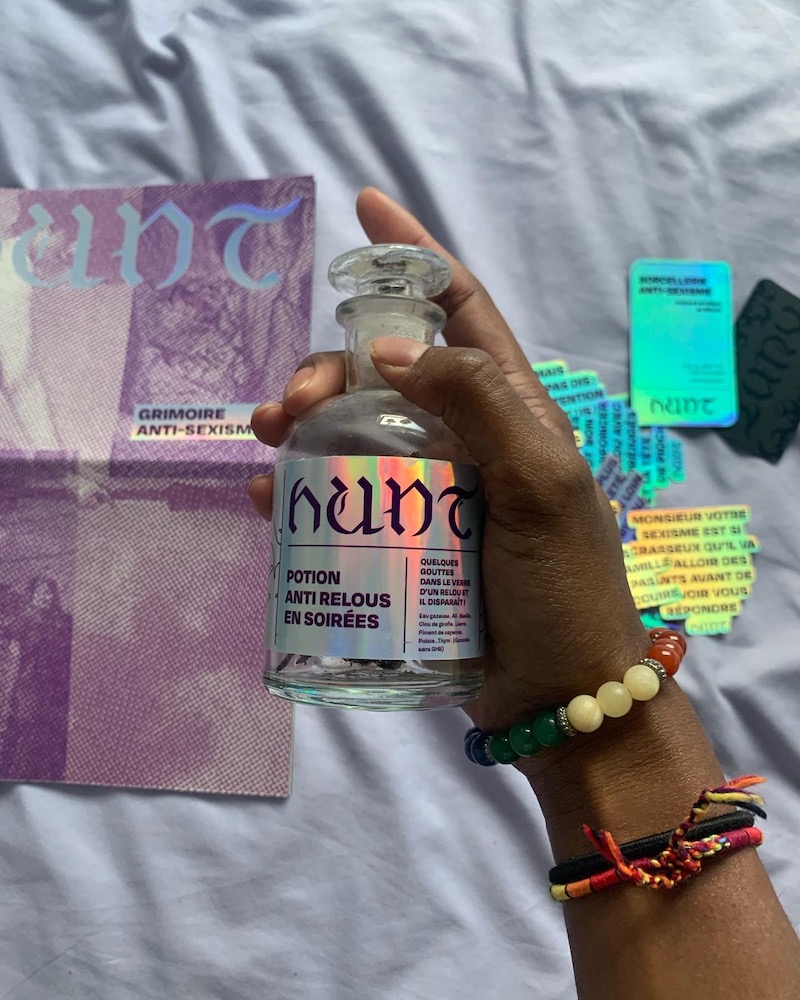 Hunt présente ainsi des potions et des sortilèges anti-sexisme. Les potions prennent effet en quelques gouttes dans le verre de la cible. La pochette grimoire propose des formules magiques qui répondent aux agressions sexistes, une planche de pendule prévenant les comportements sexistes d’une cible et des éditions présentant l’évolution de la sorcière jusqu’à sa réaffirmation dans les mouvements féministes.